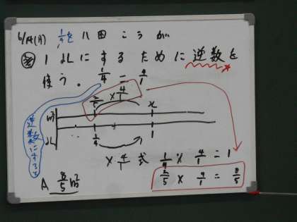 こちらは,「逆数×逆数=1」になるという決まりを使って,も求めたい1dL分を出すために,1/4dLの逆数である4/1をかけるという考え方です。これも,2/5×4と同じ答えになります。