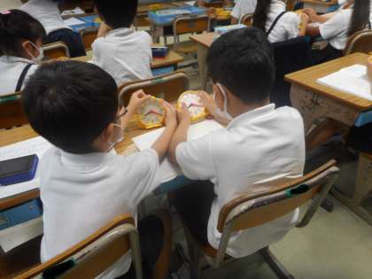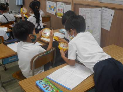 近くの人たちと時計を動かしながら,8時から8時20分までの時間について考えました。