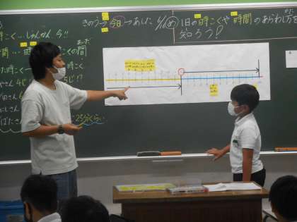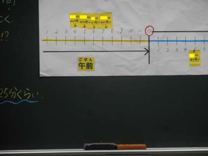 「時計のものさし」にみんなが起きた時刻や寝た時刻,「午前」などの言葉をおいていきました。