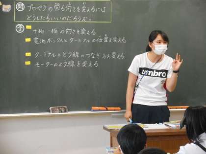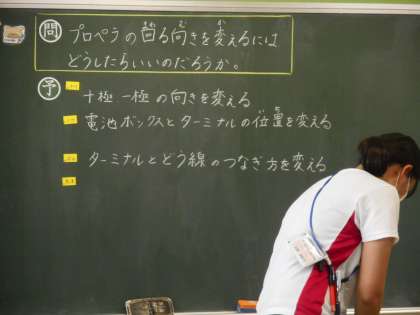 4年理科の学習です。プロペラの回転を反対にする方法を考えています。