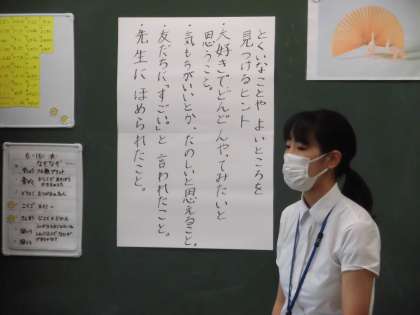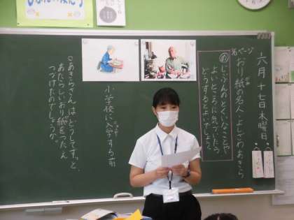 2年2組 「道徳」 教育実習生の授業 公開日 2021/06/17 更新日 2021/06/17 2年 「おりがみの名人」というお話です。 自分の得意なことやよいところをみつけることができたかな。 ヒントを出して,自分のよさに気づけるように工夫をしていました。