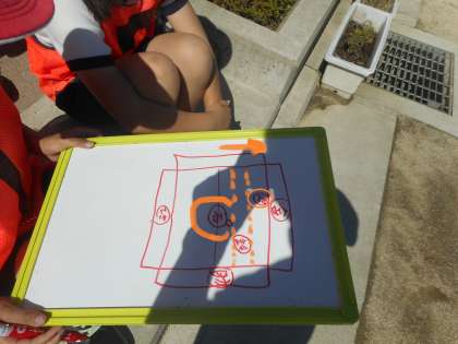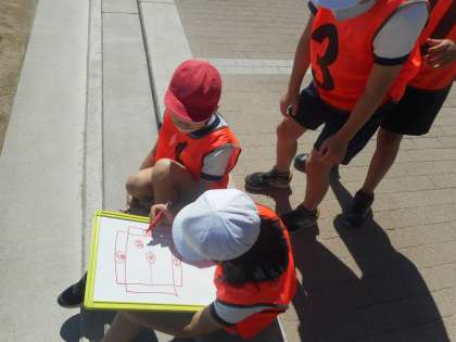 4年2組 ラインポートボール 3 公開日 2021/06/17 更新日 2021/06/17 4年 このチーム(オレンジ)も,ゴールにむけて前からエリアを3つに分け,一番後ろの人が全体をカバーする作戦のようです。