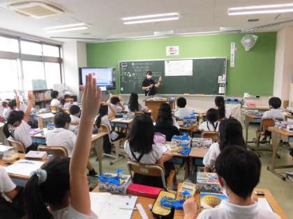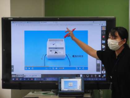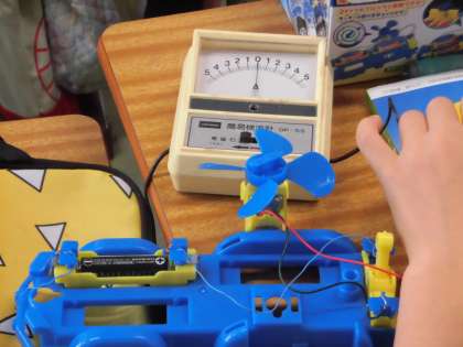 4年4組 理科 「電気が流れる向き」 公開日 2021/06/18 更新日 2021/06/18 4年 電気が流れる向きについての学習です。 電流計で見たり,プロペラのまわり方を見たりして確認しています。
