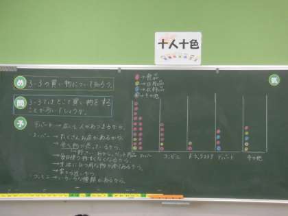 3年3組 社会 「買い物調べ」 公開日 2021/06/21 更新日 2021/06/21 3年 3年3組では、どこで買い物をすることが多いだろう? 表にして、気づいたことを出し合っていました。 色分けして数に着目することで、どこで何を買うことが多いのか、がよくわかりますね。