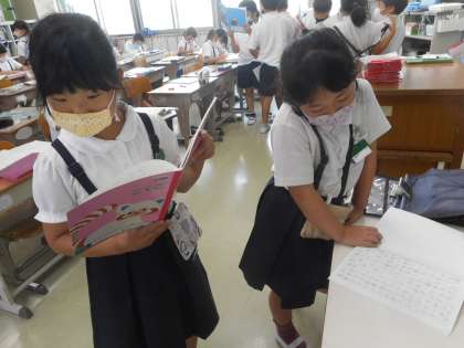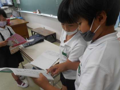 書けた人どうしでノートを交換して読み合っています。いろいろな人の感じ方に触れるのは大切です。