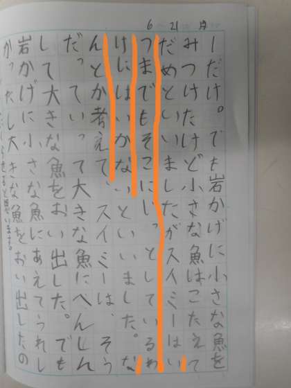 2年2組 国語 7 公開日 2021/06/21 更新日 2021/06/21 2年 「スイミーだったらきっとそうだろうな」とか「ここがスイミーらしいところだな」などと感じたのでしょう。思いが伝わってきます。