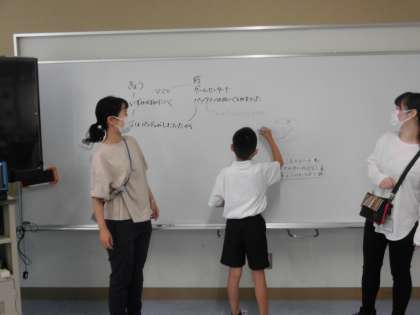 太陽学級 今日の授業から 公開日 2021/06/22 更新日 2021/06/22 太陽 学級 朝の会で「スピーチ」を行っていました。 昔懐かしい「パックマン」の話が話題に上がって、わからない子のために絵で表現しています。