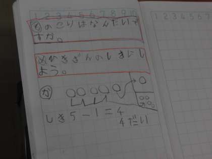 1年3組 算数 「のこりはなんだい」 公開日 2021/06/22 更新日 2021/06/22 1年 ひき算の学習の様子です。 自動車の数に着目して考えます。 「しき」にもできました。 5ー1=4 4台がのこっていますね。