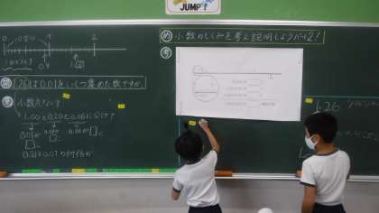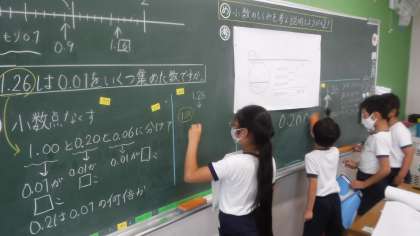 4年3組 算数 公開日 2021/06/22 更新日 2021/06/22 4年 1.26は0.01がいくつなのかを考えています。 1人の子が発言した見通しを手掛かりに考えていました。先生も多様な考えを子どもたちに出さそうと考えています。