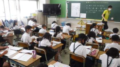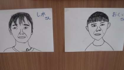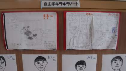 漢字の学習をしています。 廊下には,「はとぶえ」の作品が貼られていました。