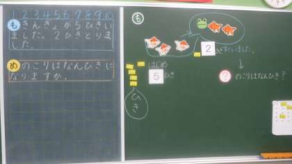 夏の風物詩キンギョが5匹いて,そこから2匹とると何匹になるのかを考えています。