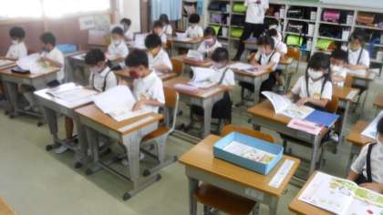 1年3組 国語 公開日 2021/06/23 更新日 2021/06/23 1年 書写の説明をしています。「みんなの字がレベルアップするように書写をするよ」と先生が言うと,「ヨッシャー」という勢いのある声がけってきました。 元気です。