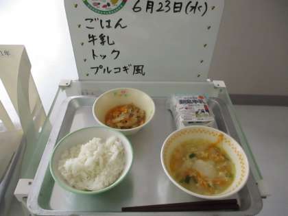 今日の給食 6月23日(水) 公開日 2021/06/23 更新日 2021/06/23 食育・給食 今日の献立は ・ごはん ・牛乳 ・トック ・プルコギ風 トックは韓国のおもちです。米には「うるち米」と「もち米」があります。日本のもちは「もち米」から作りますが、韓国のもちは「うるち米」から作ります。トックは、一つ一つ丸めるのではなく、棒状にしたものを斜めにスライスします。また、細い棒状にして短く切ったものをトッポギといいます。小おかずは、トックと同じく韓国料理のプルコギ風です。