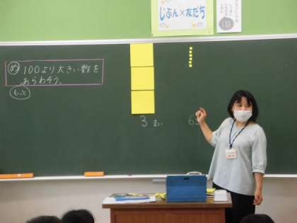 2年2組 算数 「100より大きい数」 公開日 2021/06/24 更新日 2021/06/24 2年 100が3つで300。1が6つで6。 合わせて306になるね。 大きな黄色い色紙を100・小さな色紙を1とし、視覚化しながら理解を深めていました。