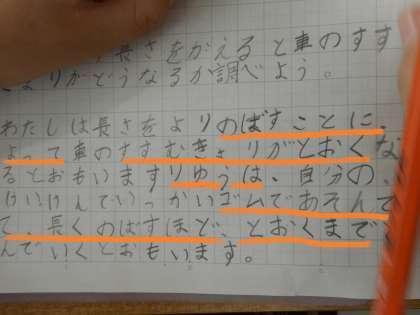 以前にゴムで遊んだ時の経験をもとに,結果の予想を立てています。このあとの学習が楽しみですね。