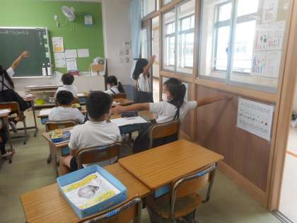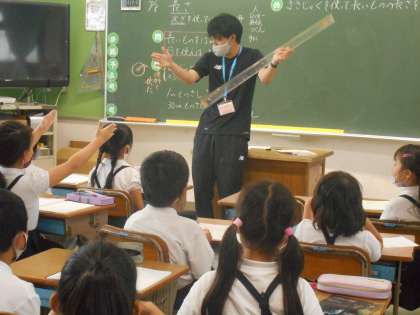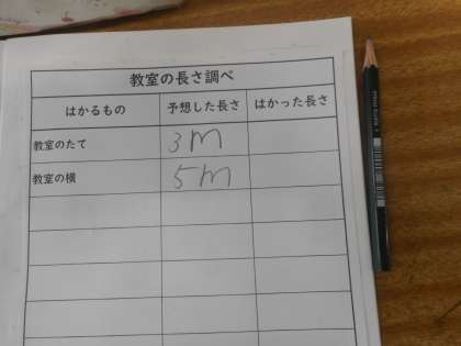 1mざしの長さから,教室のたて・横の長さを予想しています。