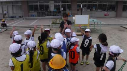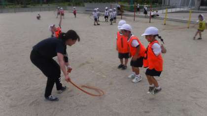 おおなわとびを使って運動をしています。 タイミングよくとぶことが大切です。