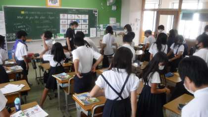 教室に入ると,元気よく英語であいさつをしてくれる2組でした。