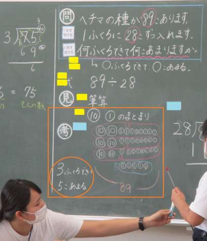 わり算の学習です。答えは出ていますが,ひっ算で計算してみると,うまくいかない場合があることに気づきました。