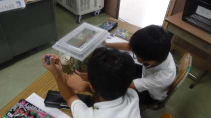 捕まえてきた虫を観察しています。