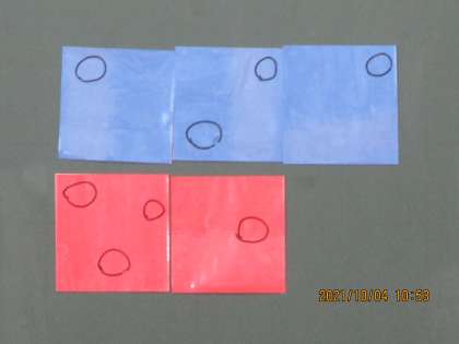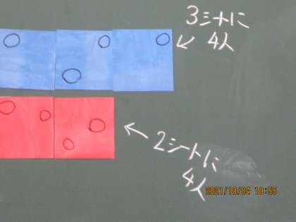広さは違いますが,どちらも4人が座っています。この場合は,狭い方の赤が「混んでいる」ことを確かめました。