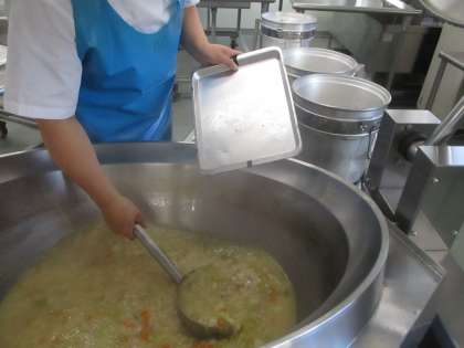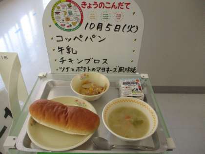 チキンブロスは、イギリスの料理です。チキンは「鶏肉」、ブロスは「だし」という意味で、鶏肉でだしをとったスープのことをいいます。チキンブロスの中にお米が入っています。お米は日本だけでなく、世界のいろいろな国で食べられていて、このようにスープの具にすることもあります。