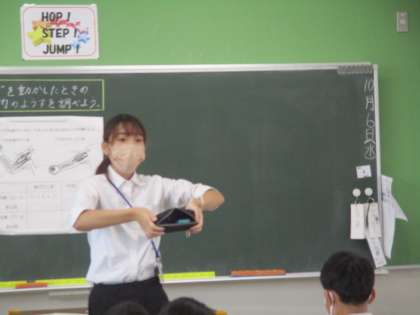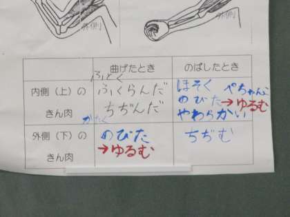 筋肉が「膨らんだ」と感じられるときには「縮んでいるのではないか」という考えを,ペンケースを使ってうまく説明していました。