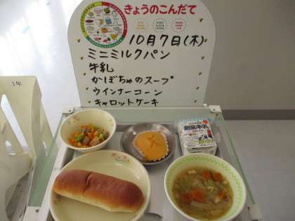 今日の献立は「目の愛護デー」献立です。10月10日は、目の愛護デーです。愛護というのは、守るという意味です。目を守るには、「ビタミンA」という栄養成分が役立ちます。今日のかぼちゃのスープには、ビタミンAを多く含む「かぼちゃ」を、キャロットケーキには「にんじん」を使っています。この機会に、大切な目のことを考えてみましょう。