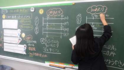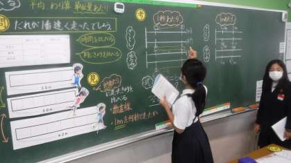 5年1組 算数 公開日 2021/10/08 更新日 2021/10/08 5年 今日の1組の算数は3人の先生が走った時に誰がいちばん早いのかを考えていました。 どのように比べるといいのかを説明していました。