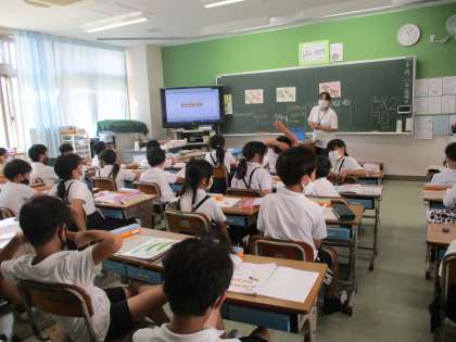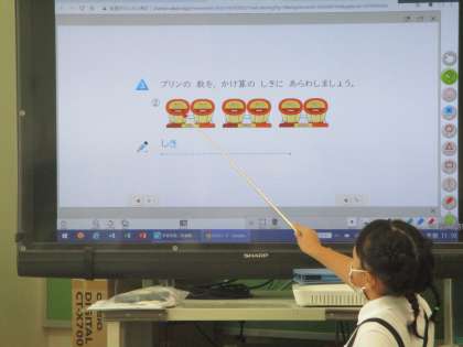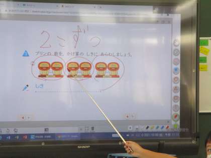 かけ算の学習です。絵の場面が,どんなかけ算になるのかをみんなに説明しています。