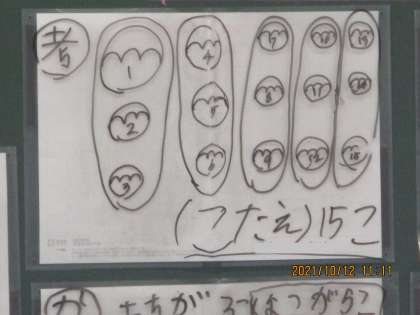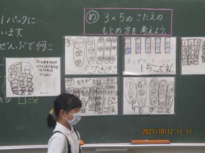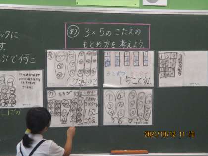 各自の考えを黒板で交流します。「1パックあたり3つ」が「5つ分」あることがきちんと表されています。