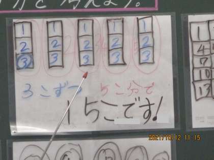 1パックあたり3こ が 5パック あることが一目瞭然です。