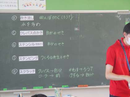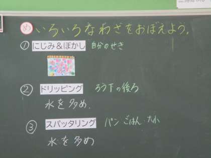 絵筆で色を塗るだけではない,いろいろな表し方を学んでいます。