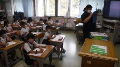 日記の書き方を説明しています。 1年生では相手意識を持つために「せんせいあのね」という文章から書きだします。