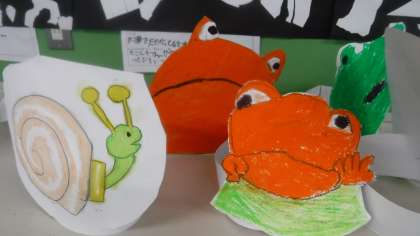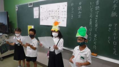 お手紙の音読劇をしていました。 教室の後ろには,かわいらしい作品が置かれていました。