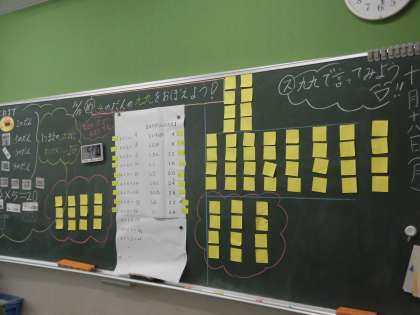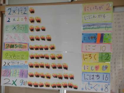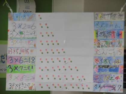2年4組 算数 「九九をおぼえよう」 公開日 2021/10/18 更新日 2021/10/18 2年 九九を楽しみながらおぼえるために,九九の表を自作していました。 楽しくおぼえて,全部の九九を言えるようになってね。