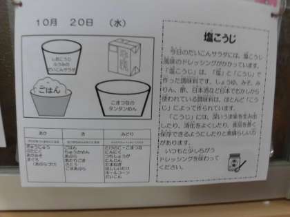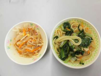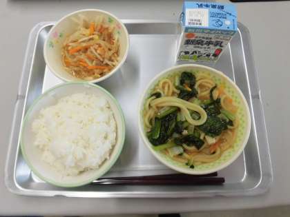 今日のメニューは「ごはん・牛乳・小松菜のタンタンメン・塩こうじ風味の大根サラダ」です。タンタンメンが,ピリッと辛くておいしいです。