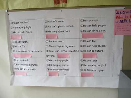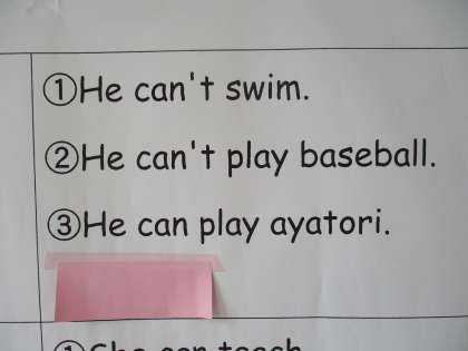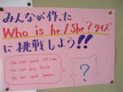英語のクイズに答えてみよう 公開日 2021/10/22 更新日 2021/10/22 5年 3階の掲示板に,英語のおもしろいクイズが貼られています。泳げなくて野球も苦手だけどあやとりができる彼はだれでしょう。みんなのよく知っている人です。
