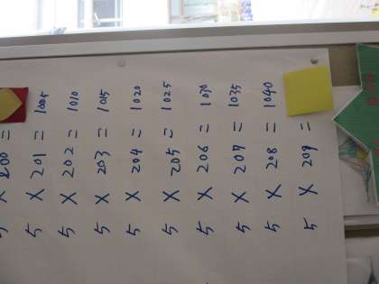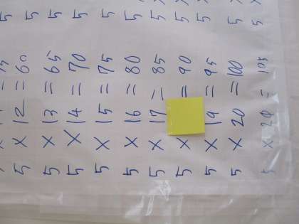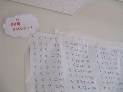 2年生の掲示物です。五九45をはるかに超える5の段のかけ算が書かれています。