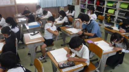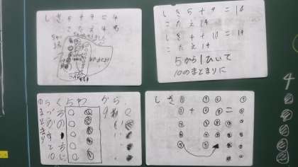〇図やブロックを操作し,10のまとまりで考えている子がたくさんいました。 先生が丁寧に子どもたちのノートを見ています。