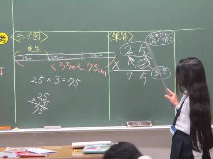 問題の数量関係を読み取って,かけ算で答えを求める学習です。図と式を関係づけて説明しています。