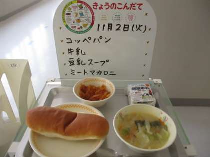「チンゲン菜」は、もともと中国の野菜ですが、今では日本でもたくさん栽培されています。色の濃い葉っぱの部分には、カロテンという成分がたくさん含まれていて、疲れ目を防ぐはたらきがあります。くせのない味なので、おひたしやスープやクリーム煮、炒め物など、和食・洋食・中国料理といろいろな料理に使うことができます。今日は、「豆乳スープ」に入っています。