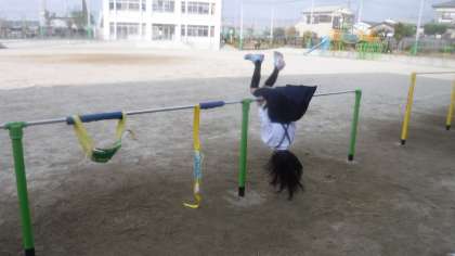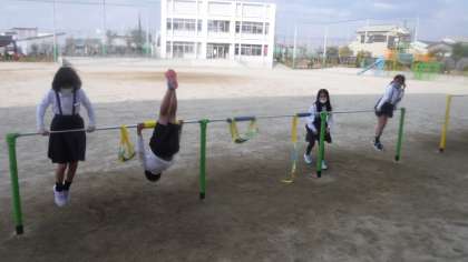 体育で鉄棒を学習している4年生です。休憩時間も教具を使い鉄棒で遊んでいます。