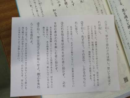 教科書とは別に,先生から孔子の「論語」から取り出した有名なフレーズのいくつかが渡されました。