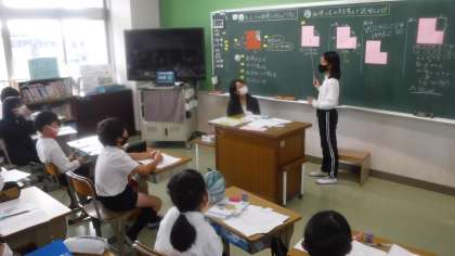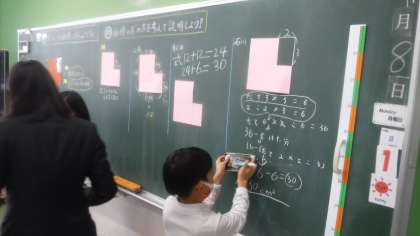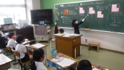 4年4組 算数 公開日 2021/11/08 更新日 2021/11/08 4年 今日は,2年次研修の研究授業が行われました。 四角形を2つ合わせたような図形の面積について考えています。 切る・引くなど,図形を見る目がついてきています。