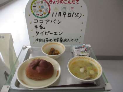 今月の「季節の野菜」は「小松菜」です。「小松菜」は、江戸時代鷹狩りで東京の小松川を訪れた8代将軍徳川吉宗が、昼食に出されたすまし汁に入っていた冬菜を気に入り、小松川の名をとって「小松菜」と命名したといわれています。みなさんの成長に欠かせない栄養であるカルシウム・鉄分は、同じ葉物野菜の中でも特に多く含まれています。しっかり食べたいですね。給食で使う「小松菜」は、堺市でとれたものです。今日は、肉団子の野菜あんかけに使っています。