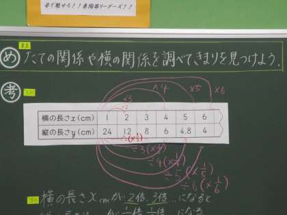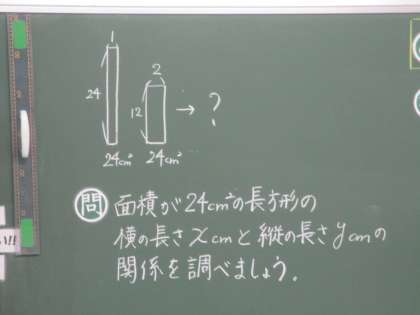 面積が一定の場合の,長方形のたてと横の長さの関係を考えています。