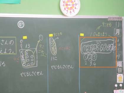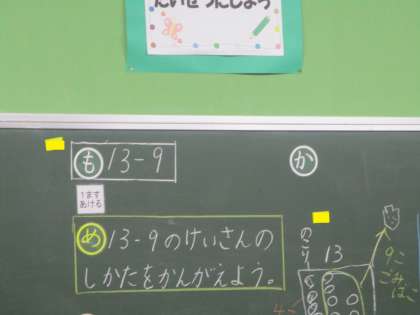 1年3組 算数 くりさがりのあるひき算 1 公開日 2021/11/10 更新日 2021/11/10 1年 くりさがりのあるひき算の計算の仕方を考えています。他の2つとは違う右の考え方(オレンジの□)についてみんなで考えます。