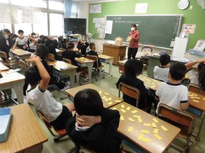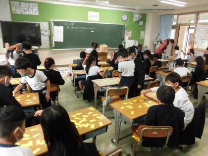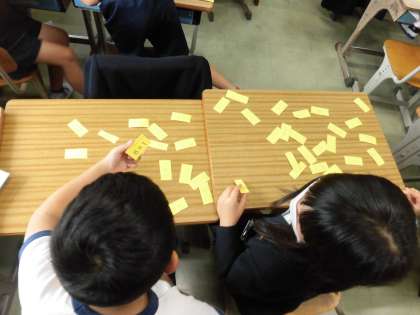 九九バトルを行っています。 答えと式をつなぎ合わせるゲームです。 楽しみながらかけ算を習得していきます。
