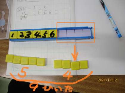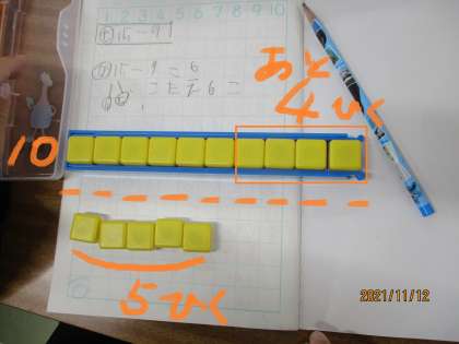 1年3組 算数 くりさがりのあるひき算 3 公開日 2021/11/12 更新日 2021/11/12 1年 ひかれる数の15を「10」にするために,ひく数9を「5」と「4」に分け,15から5を引きました。あと4をひけば,合わせて9をひいたことになります。